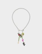 Take your style to another dimension with this cosmic-inspired necklace. Strung on a delicate bead chain, it showcases an out-of-this-world mix of charms—think aliens, flying saucers, playful lips, and adorable animal hearts. Sparkling green stones add celestial glamour throughout. Crafted from metal, glass crystal, and plastic with a secure lobster clasp, this piece is your ticket to intergalactic fashion fun.