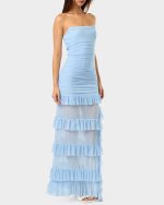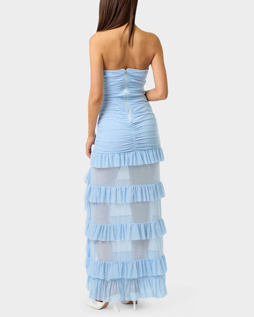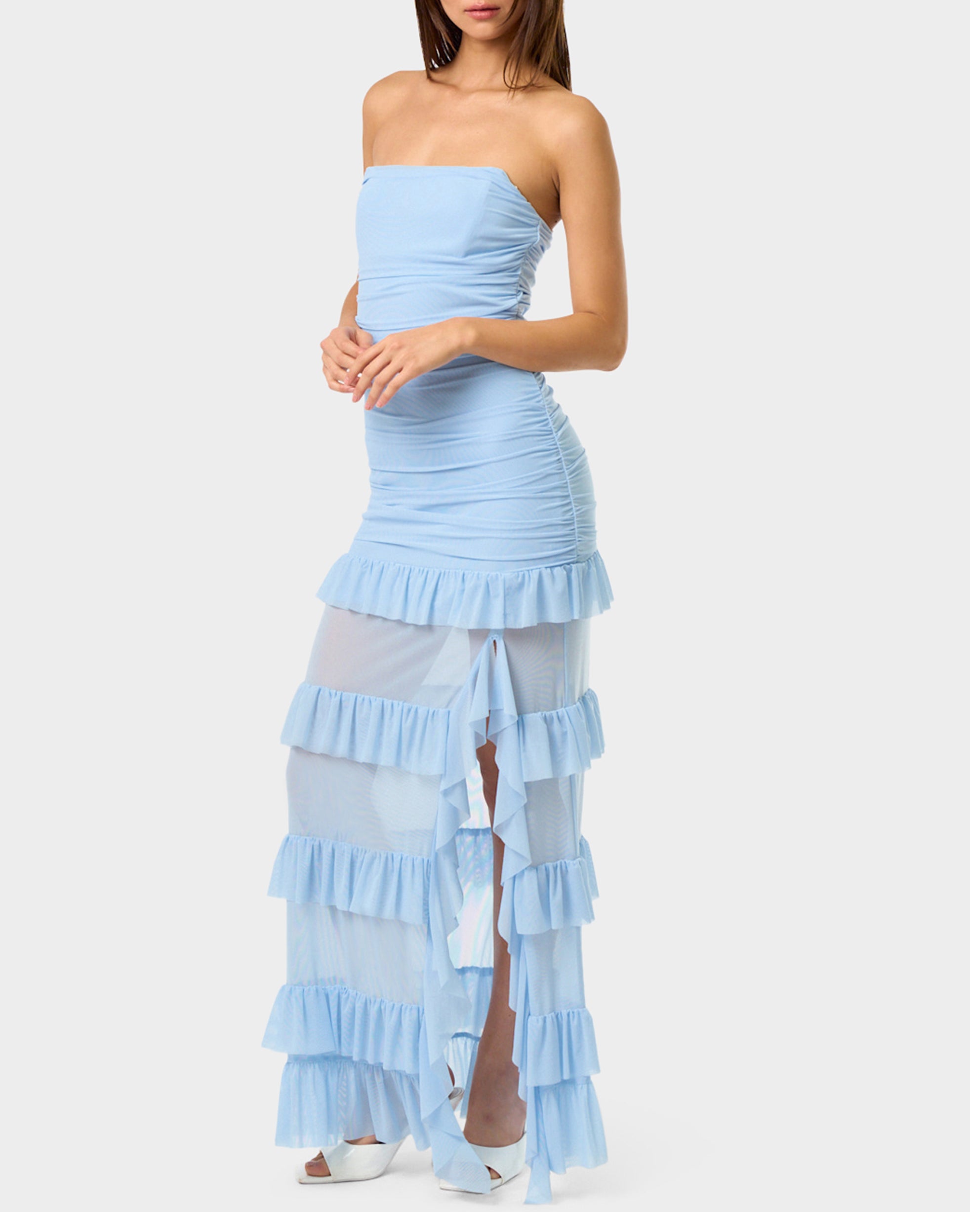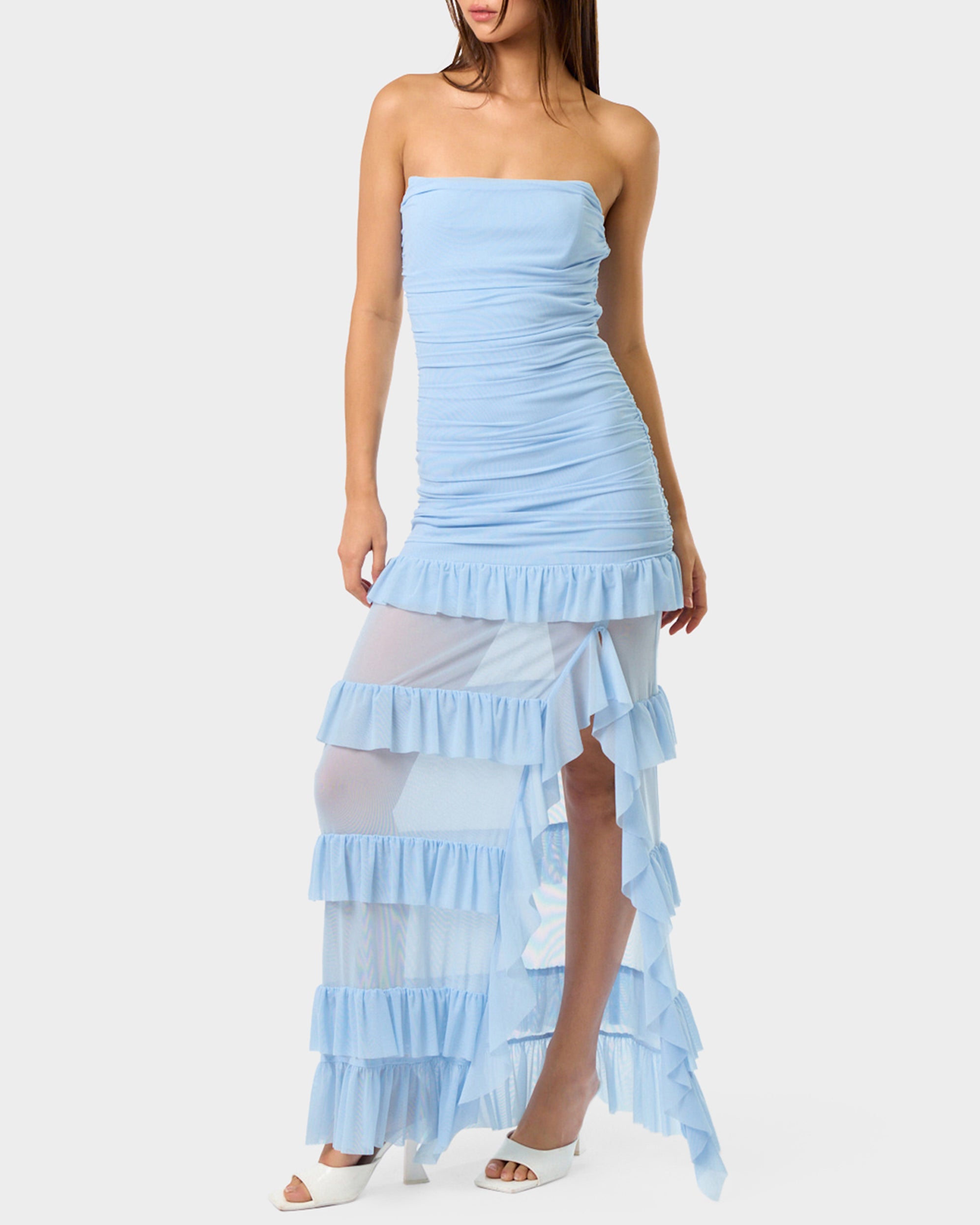 Turn heads in our strapless maxi dress that’s equal parts elegance and edge. The sheer leg panels feature playful ruffle detailing that adds movement and flirtation to every step. Whether you’re hitting the dance floor at a party or soaking up sun on vacation, this light blue stunner delivers that perfect balance of sophisticated and fun. Slip it on and let the good times roll.