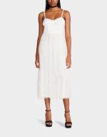 . This white dress features a flattering corset-style silhouette in a mesh polka dot print overlay that is sure to turn heads.
