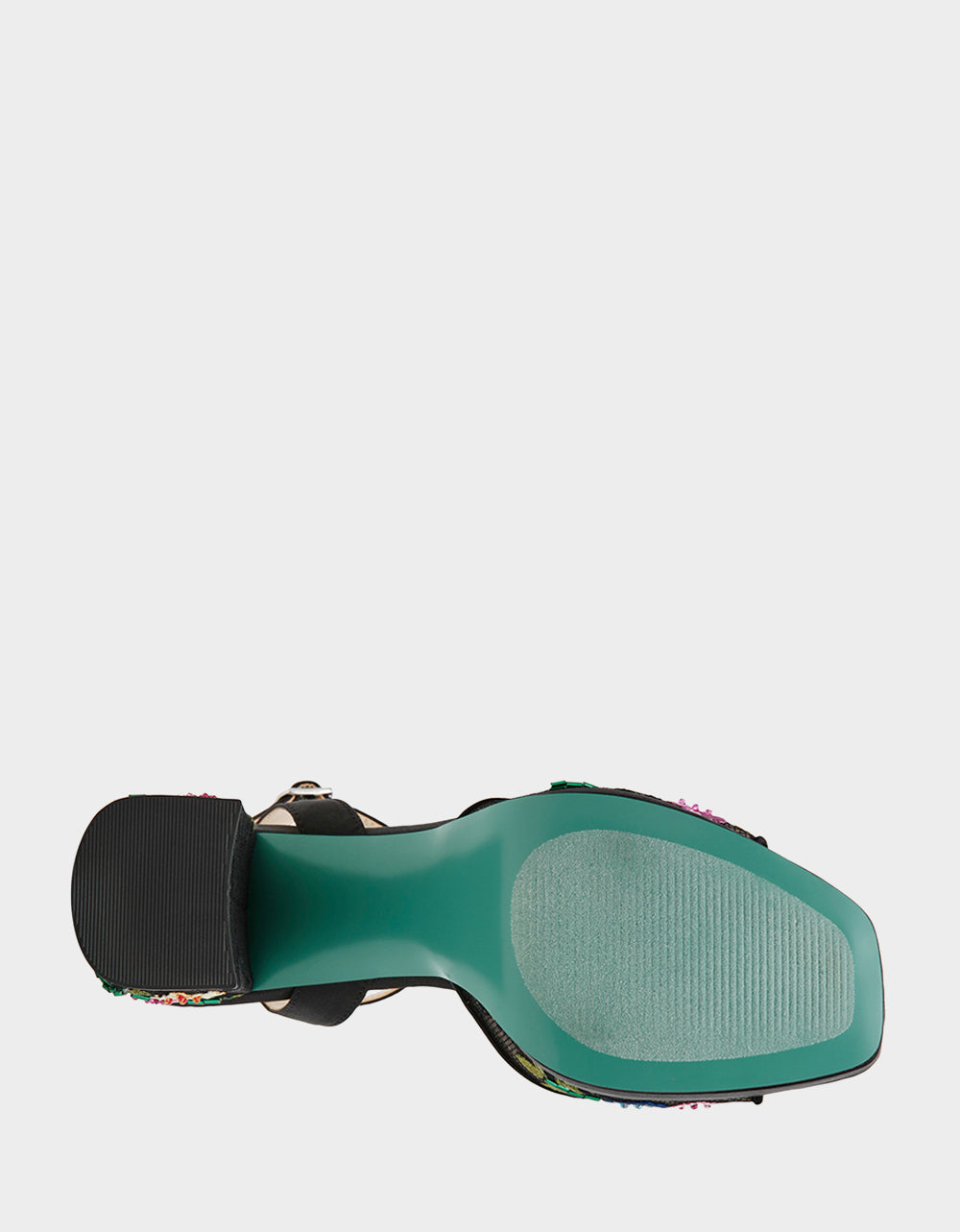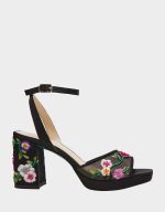 – a playful mesh floral print heel with beaded detailing! Heightened by a chunky block heel and secure ankle strap, these heels also feature a platform for added comfort and style.