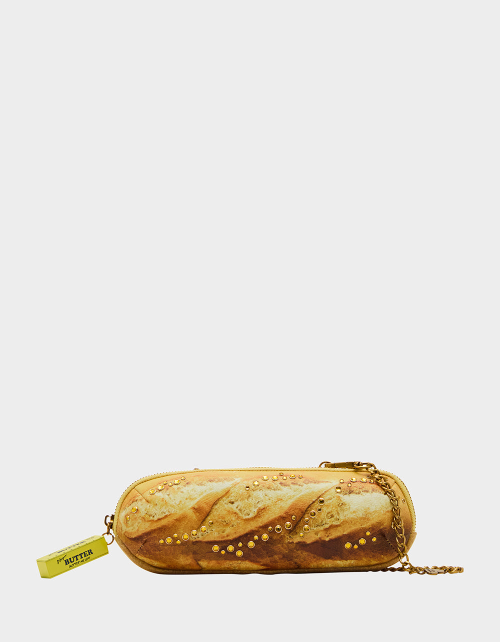 Adorned with rhinestone embellishments, this baguette-shaped bag comes complete with a chain strap and secure top zipper closure. A quirky and playful addition to any outfit!