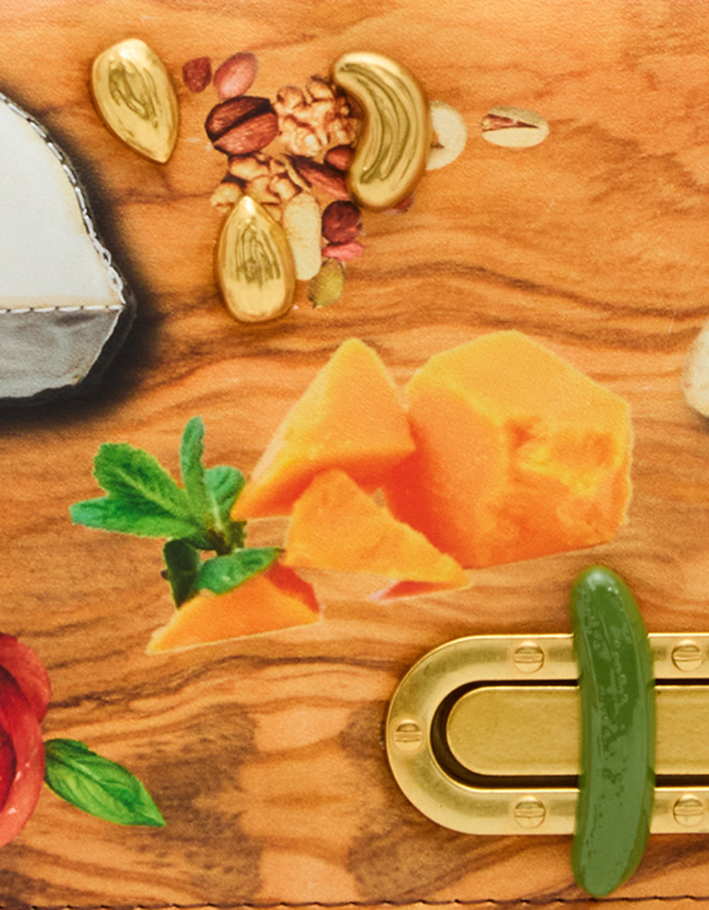 The KITSCH CHAR-CUTE-ERIE WALLET ON CHAIN MULTI is a playful accessory designed for food lovers. It features 12 card slots, two large slip pockets, and a center zipper compartment for organized storage. The charming charcuterie print showcases meats, cheeses, and olives, adding a fun twist to your everyday look. A honey jar charm on the zipper and a pickle closure add an extra touch of whimsy. Perfect for keeping essentials stylishly secure on the go.