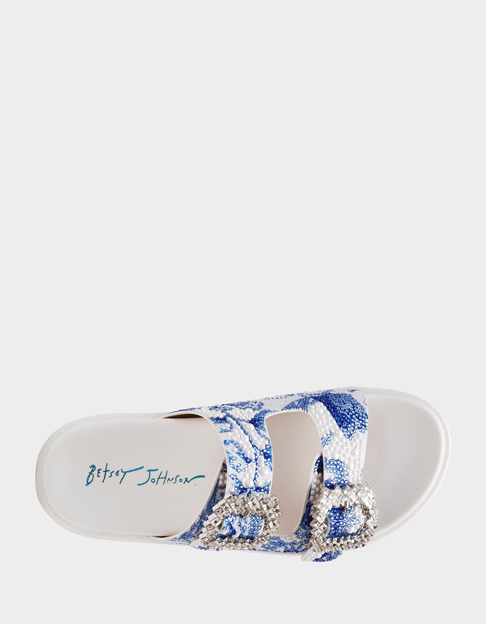 Step into playful elegance with the MATIE WHITE BLUE FLORAL footbed sandal. This slip-on style features sparkling rhinestone buckles and is covered in dazzling rhinestones and pearls for a eye-catching shine. Perfect for adding a touch of fun and glamour to any outfit, these sandals blend comfort with chic flair effortlessly.