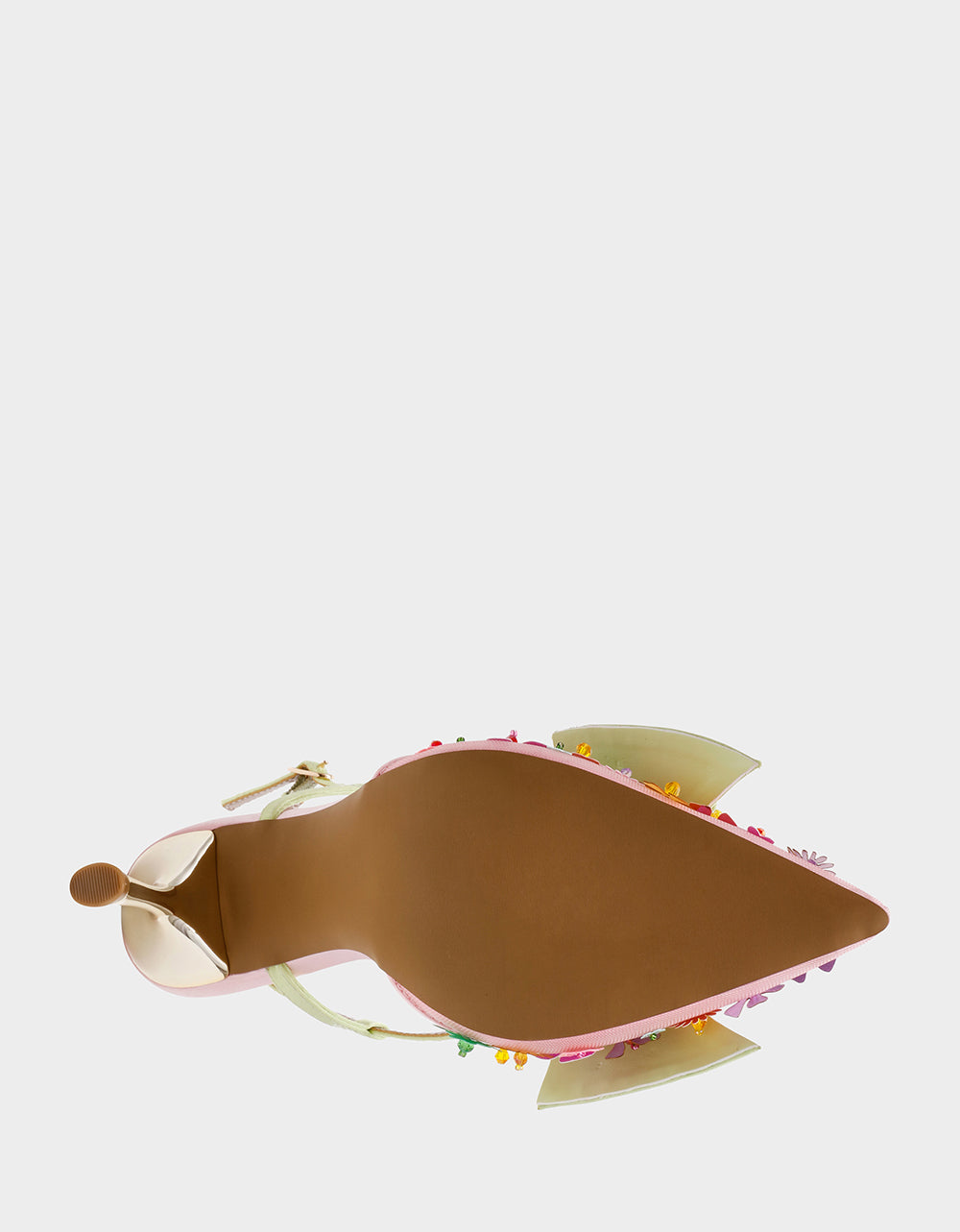 Step into the spotlight with MELISA PINK MULTI, where a bold bow and vibrant floral details bring playful charm to every stride. The strappy design adds flirty flair, perfectly paired with a sleek stiletto heel to elevate your look. Bright, fun, and impossible to ignore—these shoes are made for turning heads.