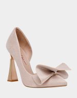 with a charming bow detail. Perfect for adding a touch of glamour to any outfit, these pumps feature a sleek and glossy metallic?heel?with a touch of glittery fabric for a truly eye-catching look.