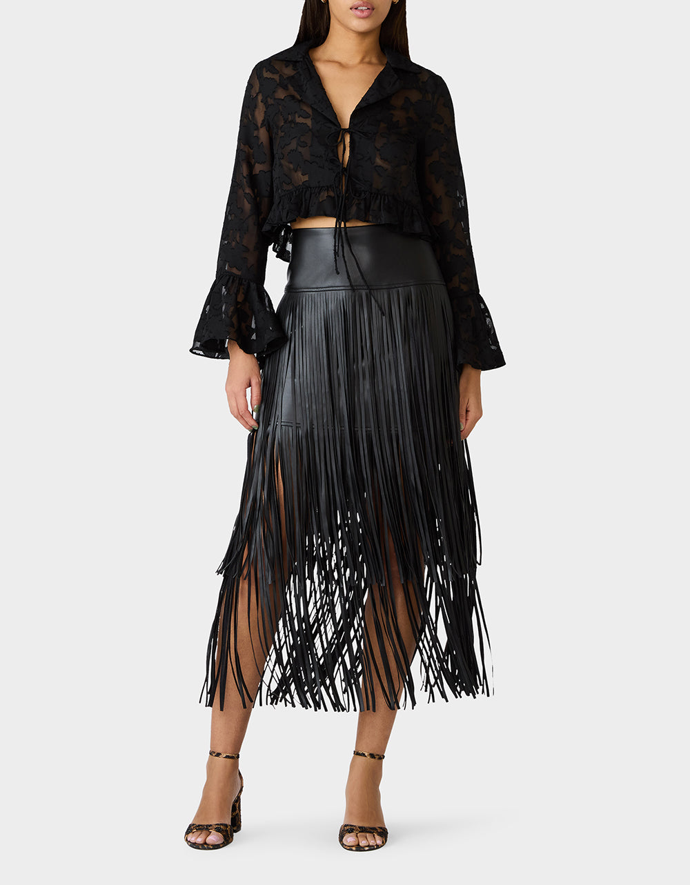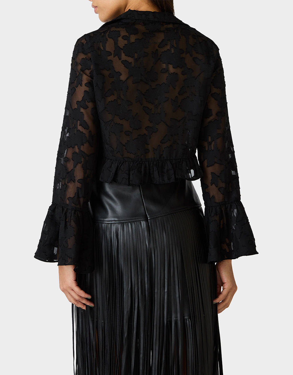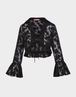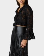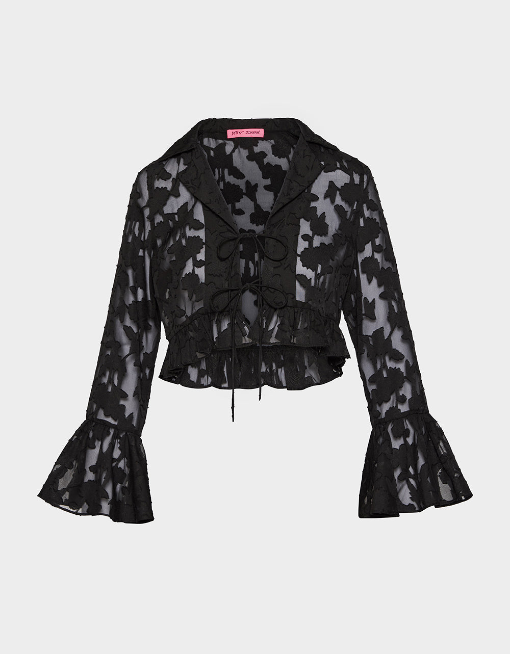 Flirty mesh meets fashion-forward flair with the Ophelia Noir Blouse. This black beauty features a chic tie-front closure and a V-neckline that screams effortless charm, while dramatic flared long sleeves add movement and personality. An abstract floral print dances across the sheer mesh fabric, giving you endless styling possibilities! Dress it up for a night out or keep it casual for everyday cool. Versatile, playful, and undeniably you.