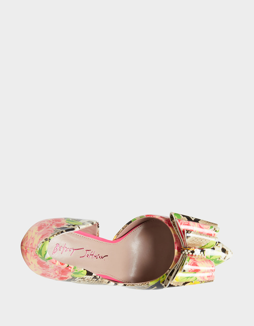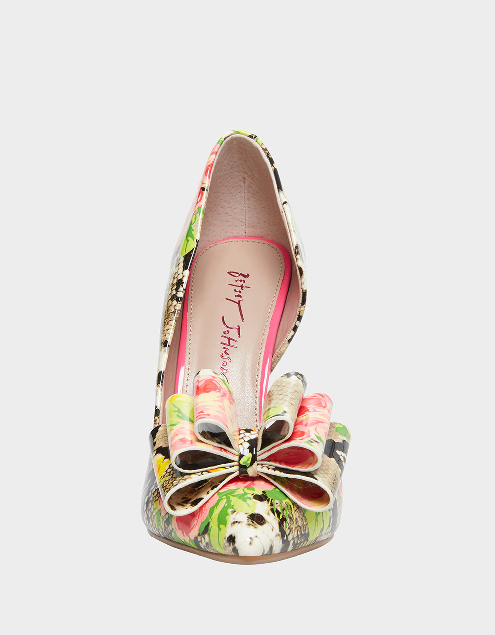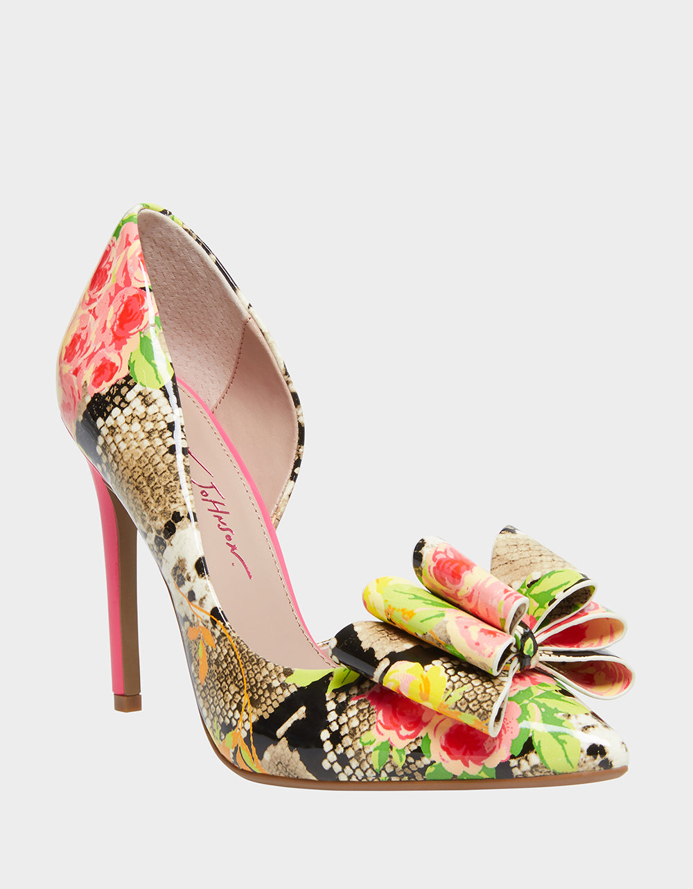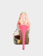 PRINCE-P is a classic pump with some twists. This stiletto is a quirkier version of the classic from it’s bold printed fabric, open side and large bow on the toe!