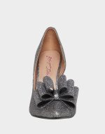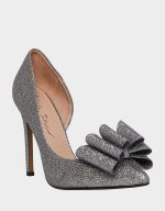 PRINCE is a classic pump with some twists. This stiletto screams glitz and glamour with its metallic fabric, open side and large bow on the toe!