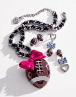 ! Stunning curb chain necklace with woven ribbon and playful football pendant adorned with colorful pink bow hardware. Necklace has an adjustable lobster clasp closure. Made from metal and ribbon.