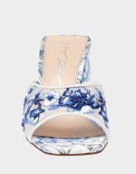 ! This stunning sandal features a sturdy block heel and a breezy slip-on toe strap embellished with vibrant blue floral patterns, making it the perfect match for dresses or denim.