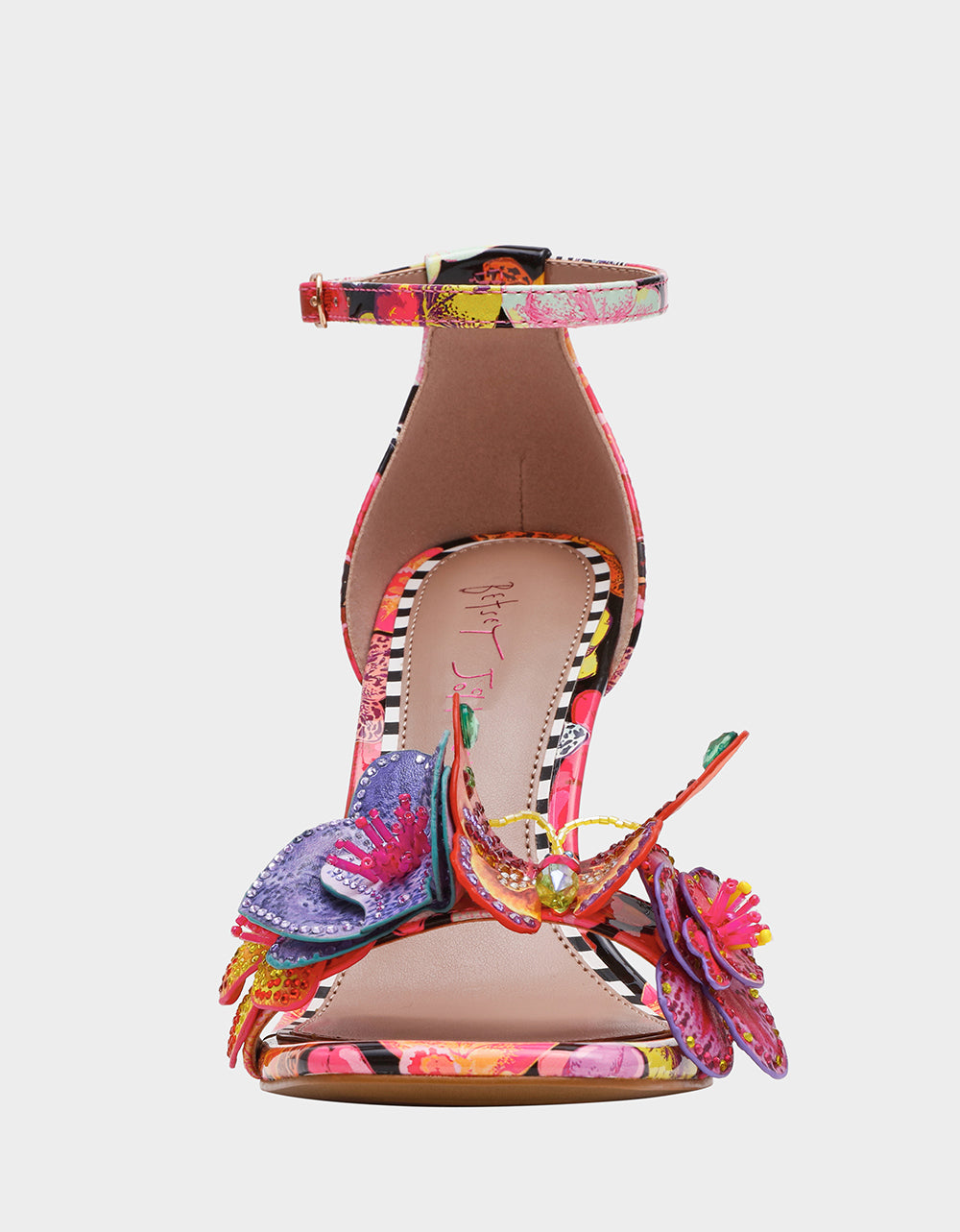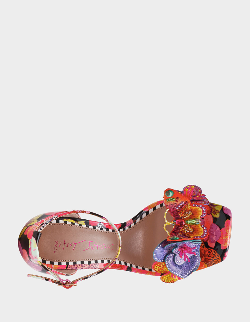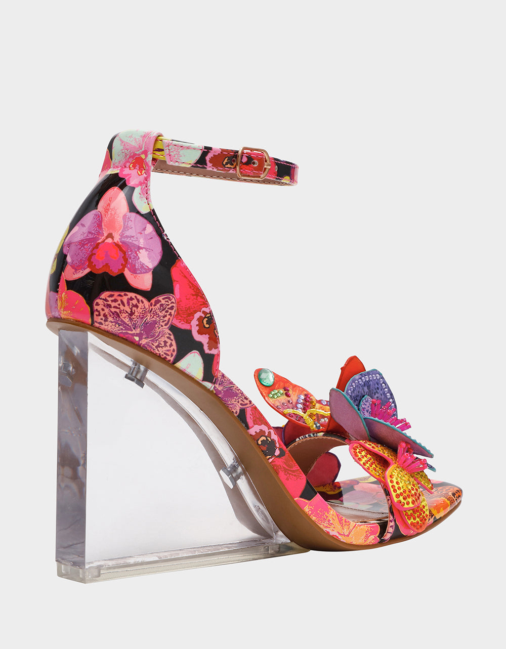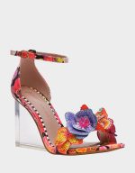 Step into whimsy with the SANTINO BLACK MULTI—a show-stopping shoe that brings the garden to life. Adorable 3D floral and butterfly details dance across the upper, while sparkling rhinestone embellishments catch the light with every step. Balanced on a chic wedge Lucite heel, this playful pair delivers comfort without sacrificing that head-turning sparkle. Perfect for anyone ready to add a little magic to their stride.
