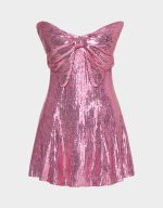 , designed to turn heads. The strapless style features a large bow at the chest, adding a fun and flirty touch. Covered entirely in shimmering sequins, its flowy silhouette lets you dance the night away with effortless charm. Perfect for making every moment shine.