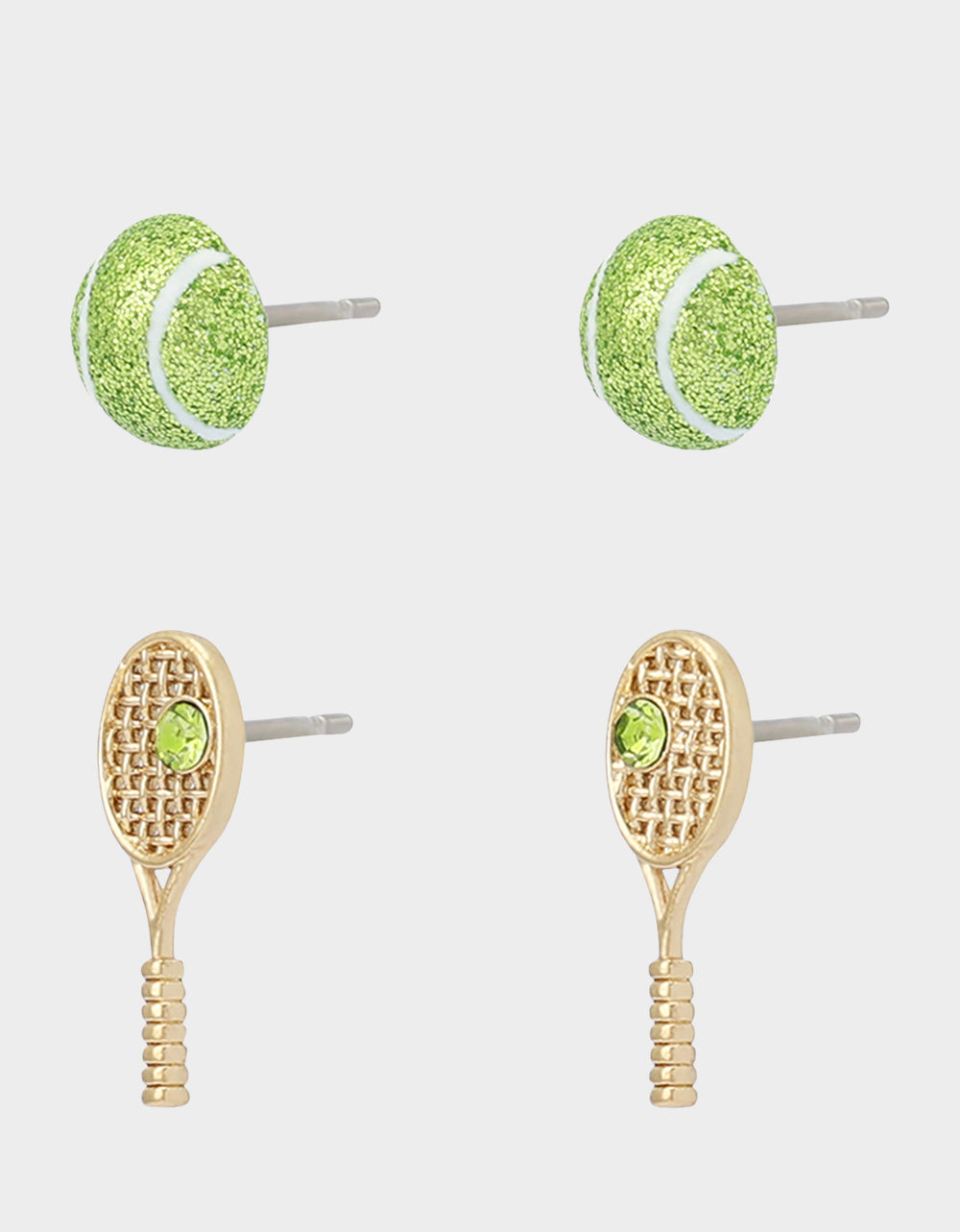 set featuring tennis ball and coordinating tennis racquet. Adorned with delicate green stone for a sparkly touch. Set includes two pairs of earrings to mix and match perfect for everyday. Earrings have post back closures. Made from metal, plastic and glass crystal.