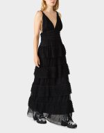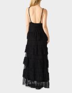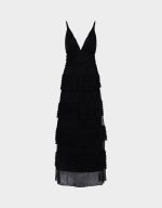 BLACK, a flirty and feminine choice for your next special occasion. The playful plunge V neckline highlights your silhouette, while the tiered tulle layers add whimsical movement and charm. Perfect for making a memorable entrance, this gown blends elegance with a fun, modern twist.