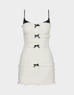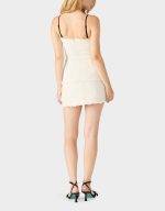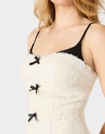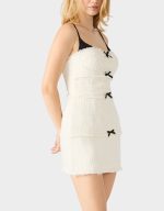OFF WHITE. This chic mini dress features a layered look with elegant tweed fabric and charming bow details that let you dress it up for a night out or keep it casual for daytime fun. Perfect for those who love versatile style with a flirty twist.