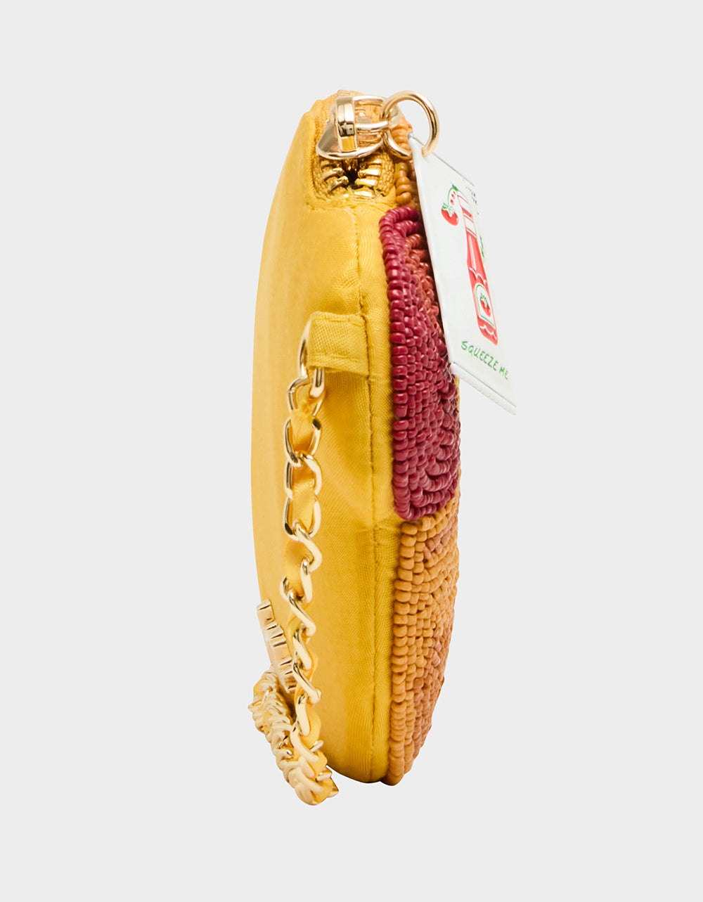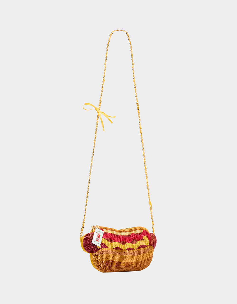 Strike out boring accessories with this hotdog-inspired crossbody bag that celebrates America’s favorite ballpark snack. Adorned with eye-catching beads and topped with a playful ketchup pack zipper, this bag is a home run for anyone who loves bold, quirky style. Sling it across your body and let your fashion game steal the show—because sometimes the best accessories are the ones that make you smile.